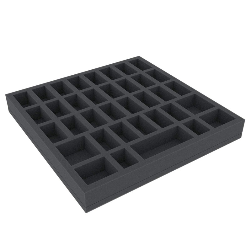 - The kit contains: 1 foam insert with 36 compartments for miniatures and markers, 1 foam insert with 9 compartments for cards, cubes and markers, 1 matching foam lid