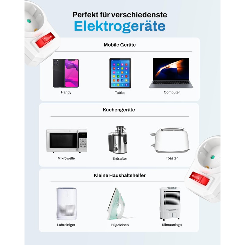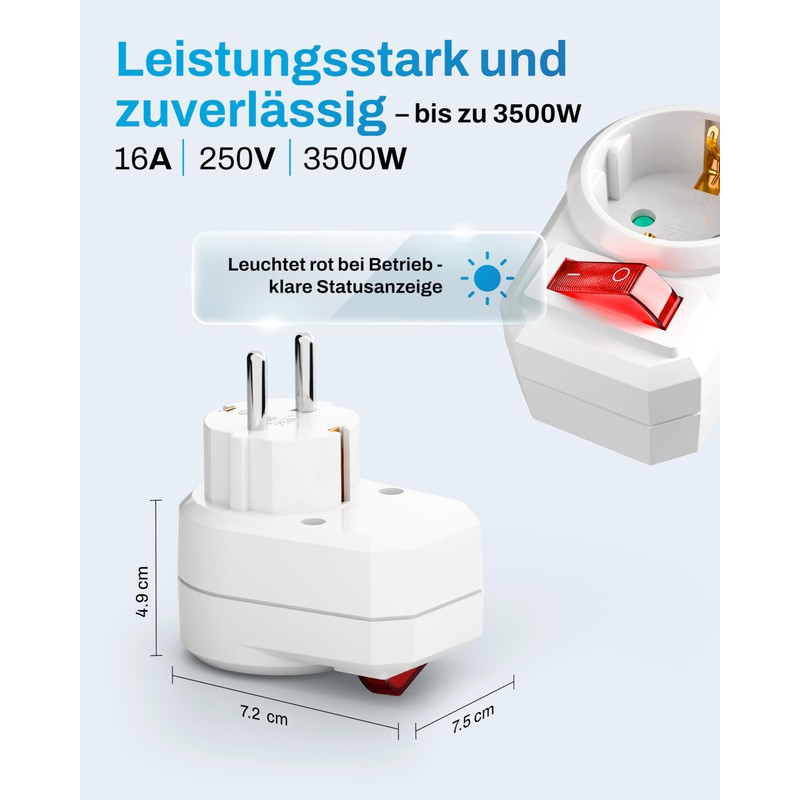 - Socket switch with comfort - The illuminated toggle switch function ensures easy handling, even in the dark. No more unnecessary electricity costs!