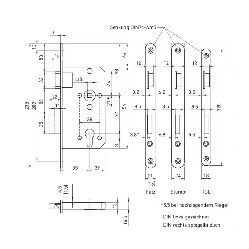 - Product details: DIN: right, backset: 55 mm, distance: 72 mm, cuff width: 18 mm, cuff length: 235 mm, cover thickness: 3 mm, square nut: 8 mm, approval: DIN 18251, class 2, safety-relevant features according to class 3