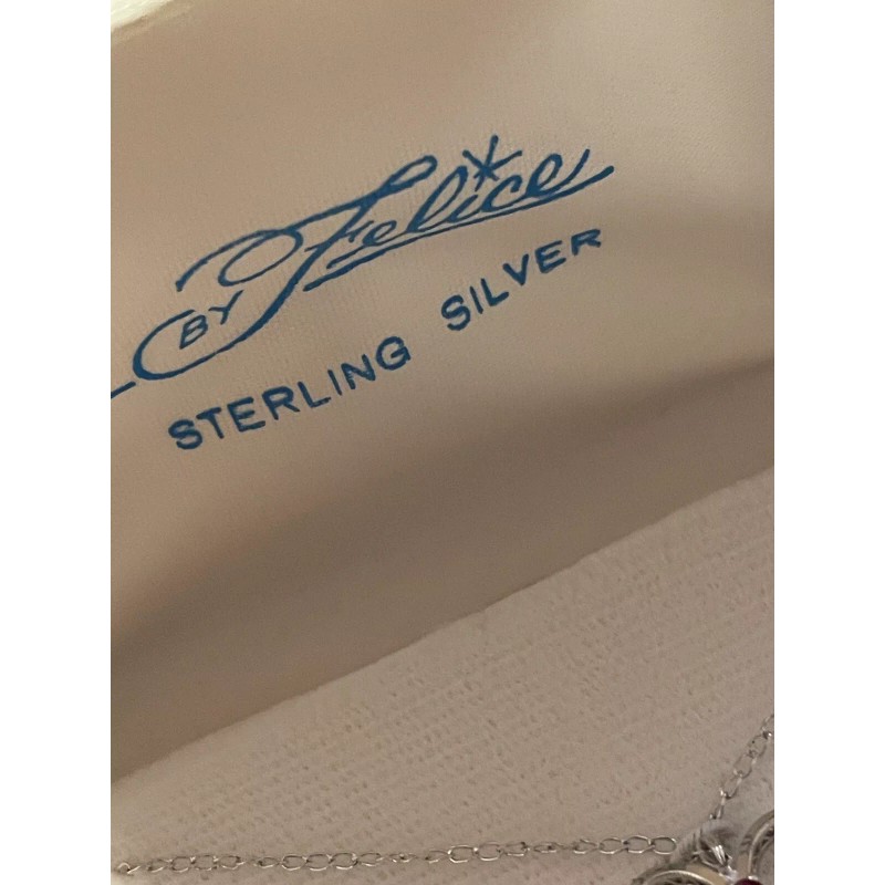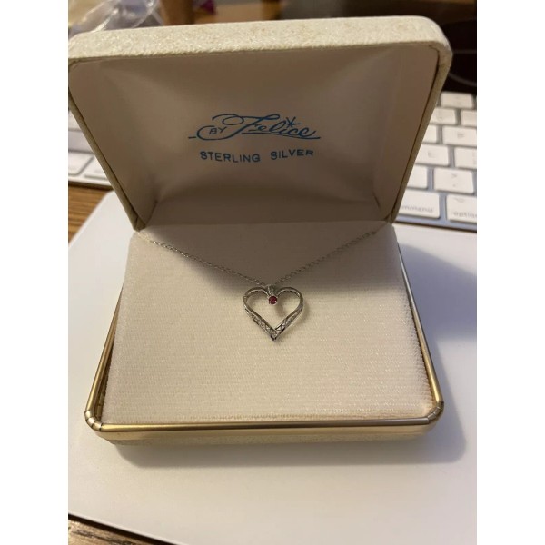 This is a beautiful vintage estate Felice sterling silver filigree heart shaped pendant with a genuine ruby accent. The heart is 5/8" x 5/8". The chain is 18" long and it has a spring ring clasp. This piece is new old stock and comes in the original box. It is a lovely piece.