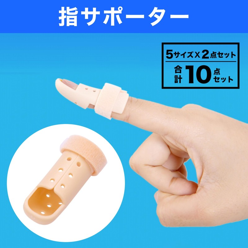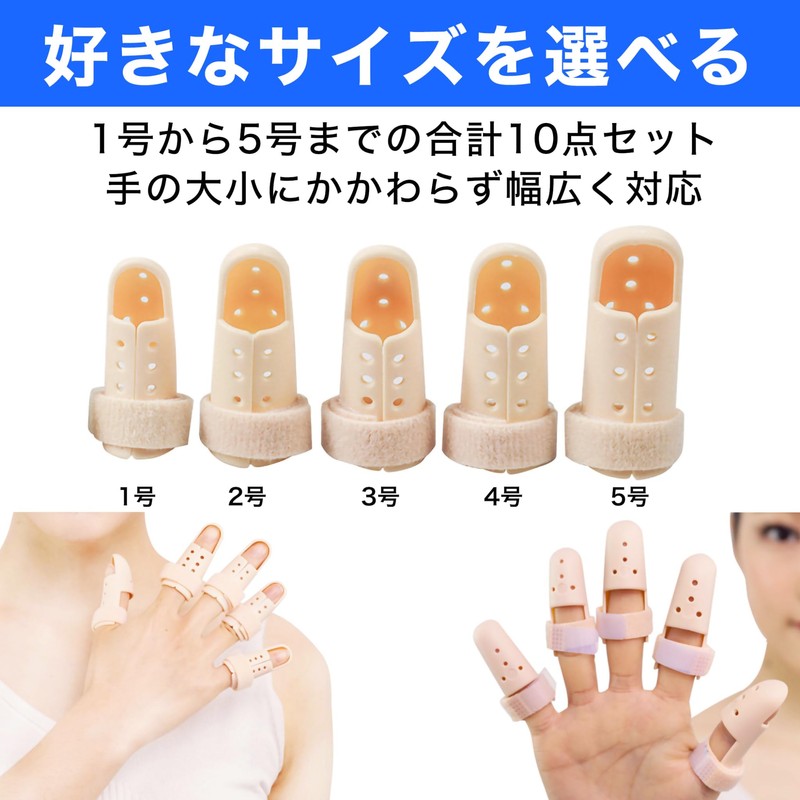- お好きなサイズで着用できるセット:親指から小指まで、手の大小にかかわらず幅広く対応できる1号から5号までの5サイズ各2点、合計10点セットでお届けします。指の第2関節あたりまでを優しくカバーしてフィット感を調整しながら固定できます。