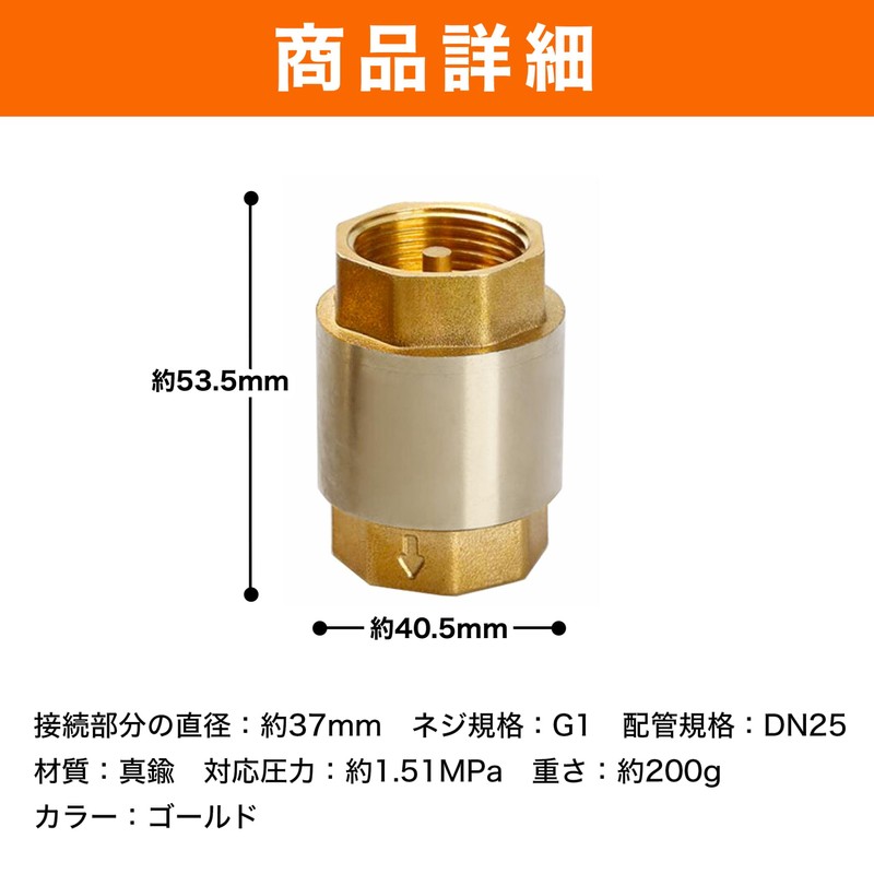 - Size: Approx. 2.1 x 1.6 inches (53.5 x 40.5 mm); Diameter of Connection: Approx. 1.5 inches (37 mm); Thread Standard: G1; Piping Standard: DN25; Material: Brass; Compatible Pressure: Approx. 1.51 MPa; Weight: Approx. 7.1 oz (200 g); Color: Gold; *Depending on your monitor settings, there may be slight differences in the color may be differences in the viewing environment