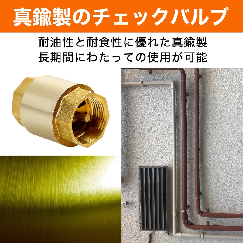 - Brass Check Valve: Brass check valve with excellent oil and corrosion resistance. Can also be used by connecting to gas piping. It is also highly durable and does not cause problems such as damage, so it can be used for a long time