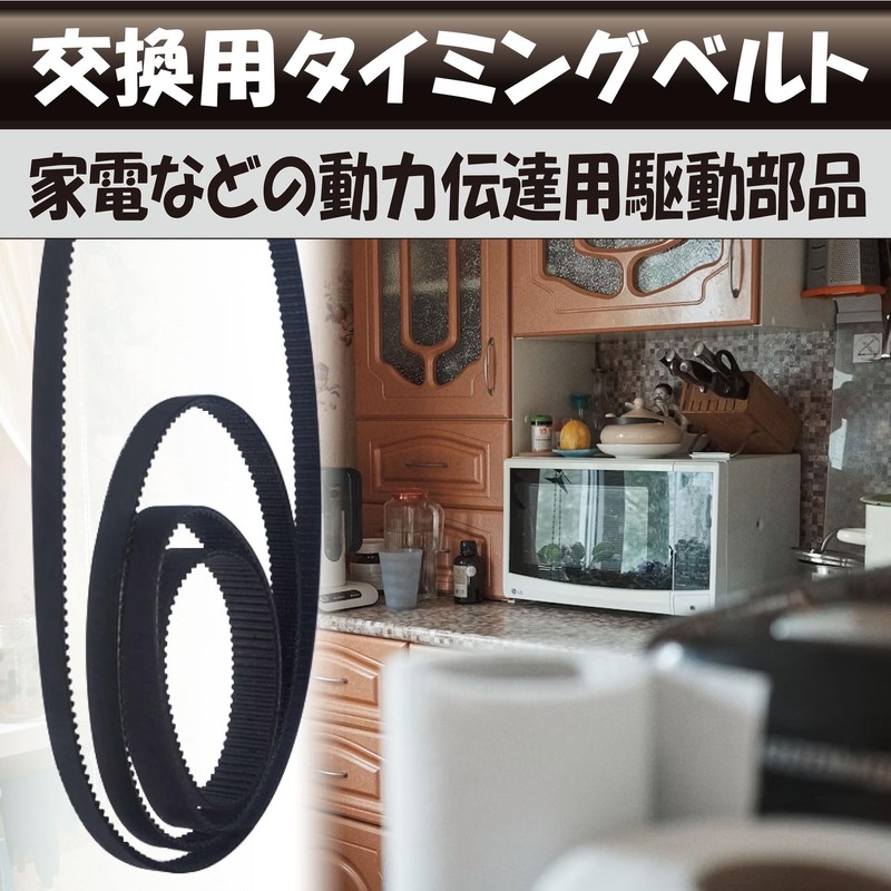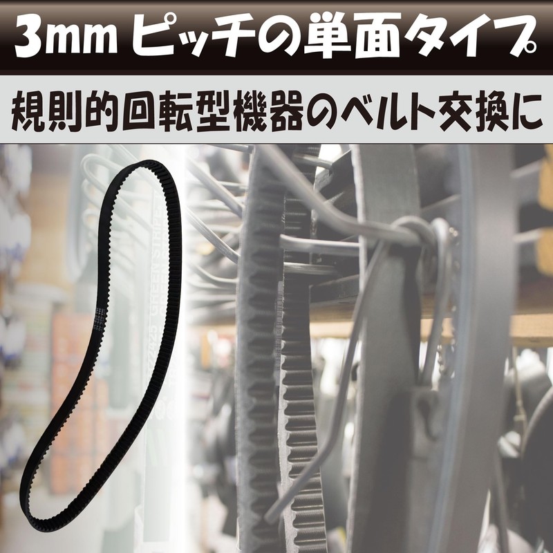 - Replacement Timing Belt: This is a timing belt that is used to transfer power such as household appliances. Product specifications are single-sided type, with a perimeter of about 20.7 inches (525 mm), a width of about 0.4 inches (10 mm), and a tooth pitch of about 0.1 inches (3 mm). An indispensable part for machines that require regular rotation