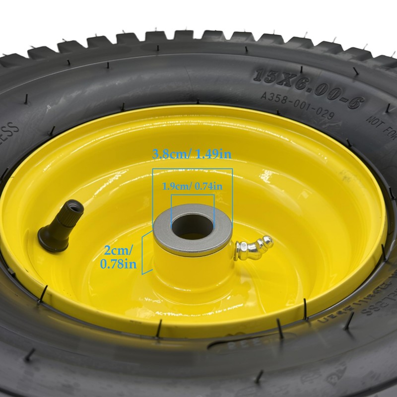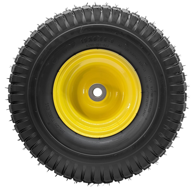• This 15x6.00-6 lawn tractor tire With a 15" tire diameter, 6" width, 6" rim diameter. Features 3/4" bearing size, 3" offset hub, 4-ply tubeless construction, and heavy-duty 570lbs load capacity