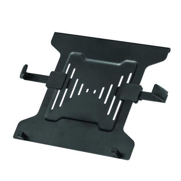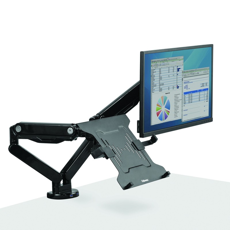 Create a more productive dual-display workspace that raises your Laptop and monitor off of your work surface. Allows you to lift, lower, tilt, Pan or rotate your Laptop into the perfect ergonomic position. Non-Slip, ventilated base allows for secure and long-term use. Supports laptops up to 17”/15 lbs. Compatible with standard VESA mounting brackets. Ideal for use with Fellowes Platinum series gas spring monitor arms.