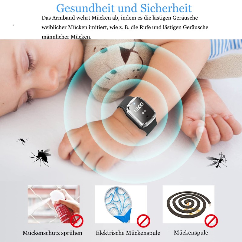 - ✔ 【Biosonisches Mückenschutz】 Dieses Mückenschutz-Armband verwendet biologische Schallwellen (Ultraschall-Bionikwellen). Die meisten Blutegel sind weibliche Mücken. Das Armband imitiert die unangenehmen Geräusche weiblicher Mücken wie die Geräusche von Mücken und männlichen Kakerlaken. Die aktualisierte Version verfügt über Funktionen zur Anzeige der Uhrzeit und der Körpertemperatur.