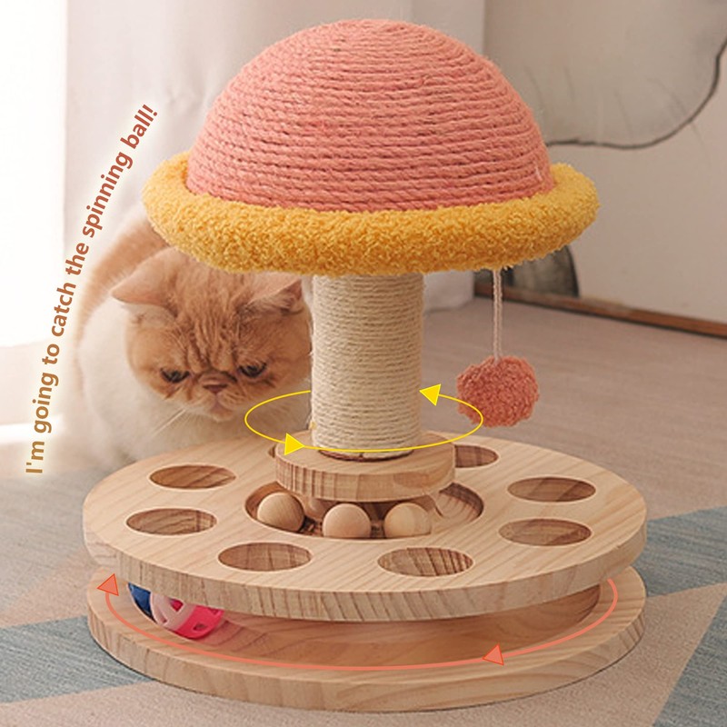 - 🍄【Cat Turntable Toy Set】: This interactive cat scratching board is a combination of cat scratching board and cat toy, with a cat scratching ball on the top, 1 *climbing posts, 2 *game balls, sisal claw grinding and entertainment all in one .The Mushroom House Toy that exercises your cat's ability to catch, this scratching post engages kittens and adult cats in multi-level play that's as functional as it is fun!