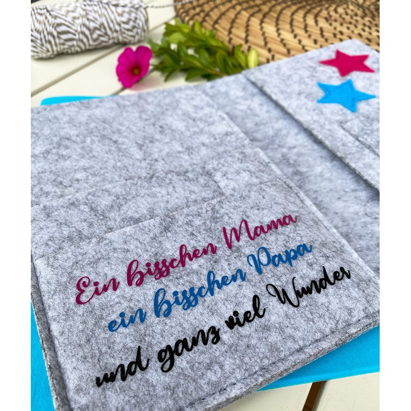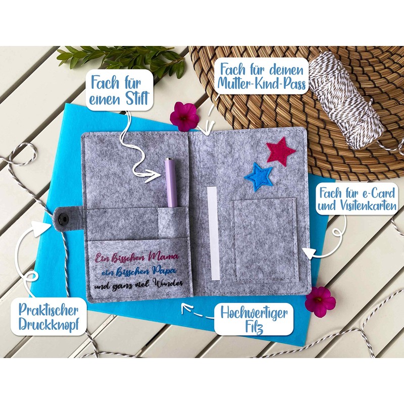 What makes our maternity log cover for the Austrian mother-child passport so unique: Compartment for your photo: On the cover of the mother passport cover there is a heart-shaped frame for e.g. the first ultrasound image of your baby or the first photo with the family. EXTRA MANY COMPARTMENTS Our Austrian maternity log cover has a total of 7 compartments. You can easily store ultrasound pictures, vaccination certificate, a pen, an insurance card, your vaccination certificate, business cards of your midwife and much more. Great design and sturdy felt: the cute and thoughtful design makes the hearts of pregnant Bald mums beat faster! To ensure that all documents are optimally protected during pregnancy, we use dense and therefore very firm felt. Perfect gift: Are you still looking for a pregnancy gift or for the next baby shower? Then the felt maternity log cover from JoliCoon is just the thing for you. It is a special companion for the expectant mother and serves not only as a cover for the Austrian maternity passport, but also as a practical organiser during pregnancy. The maternity log cover from JoliCoon - the must-have for your pregnancy. The ideal organiser for pregnant women and mums. Extra many compartments for all important documents - thanks to the press stud closure, everything stays securely in place. The maternity log is the constant companion during pregnancy