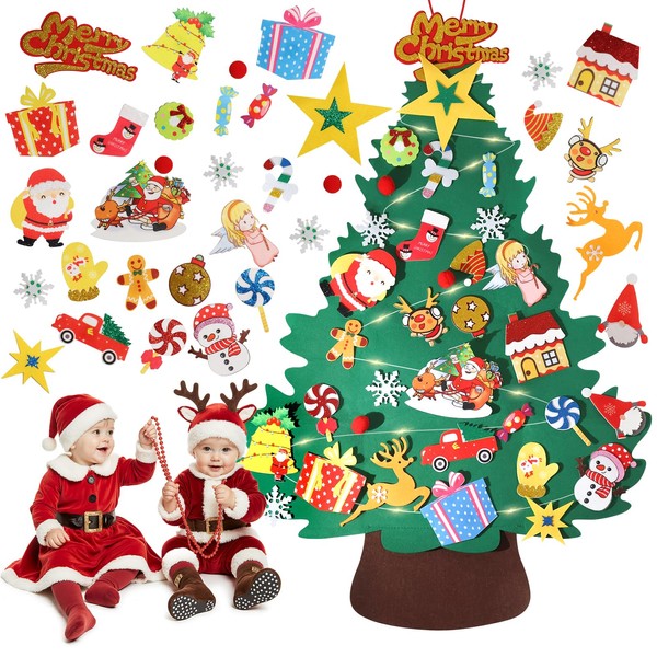 Felt Wall Christmas Tree for Kids, DIY Toddler Xmas Tree with 33 Ornaments & LED Lights, Interactive Montessori Felt Tree with Hook and Loop