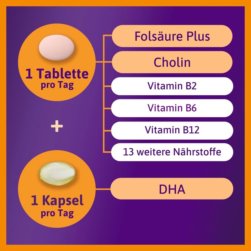 - Contents: 1 x Femibion 2 daily pregnancy supplements with folic acid plus (*3), choline, DHA for women from 13-40 SSW, 8-week pack with 56 tablets (approx. 15 mm) and 56 x capsules (approx. 15 mm)
