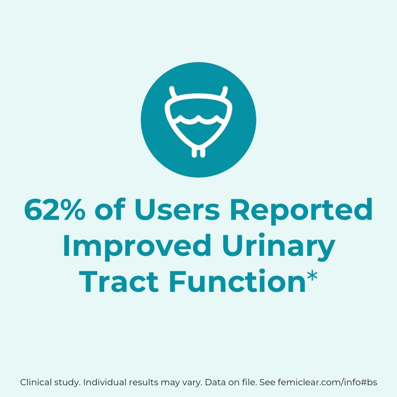 - EFFECTIVE SUPPORT: In a clinical study, 62% of Users Reported Improved Urinary Tract Function and 31% of Users Maintained a Healthy Urinary Tract After 1 Year. Individual results may vary. Data on file. Contact FemiClear