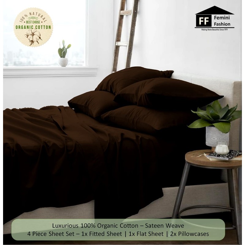 Femini Fashion Extra Deep Pockets 1000 Thread Count 100% Organic GOTS Certified Cotton, 22-Inch Deep-Pocket, 4-Piece Bed Sheet Set (1 Flat Sheet, 1 Fitted Sheet, 2 Pillow Covers) - Queen, Chocolate