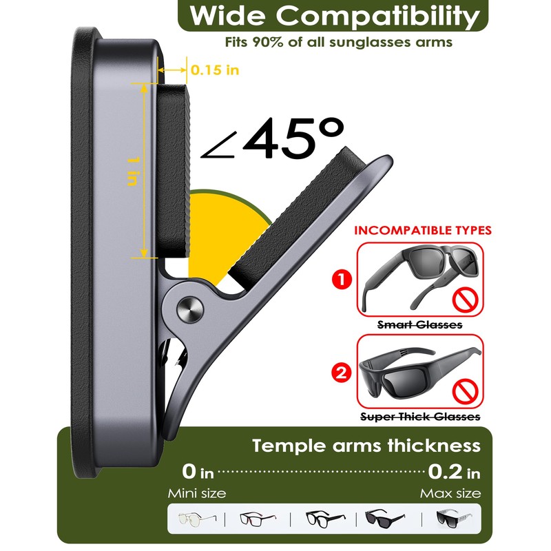 - 【𝗠𝗼𝗿𝗲 𝗧𝗵𝗮𝗻 𝗝𝘂𝘀𝘁 𝗳𝗼𝗿 𝗚𝗹𝗮𝘀𝘀𝗲𝘀, 𝗪𝗼𝗿𝗸𝘀 𝗔𝗻𝘆𝘄𝗵𝗲𝗿𝗲】This eye glass holder isn’t a one-trick pony! While it’s perfect for your sunglasses, you can also use it to clip onto other small items like keys, tees, or even your snack bag. It attach to any metal surface, making it perfect for indoor and outdoor adventure. Boat? Check. Tent? Check. Your favorite metal water bottle? You bet. Basically, if it’s metal, it’s fair game!