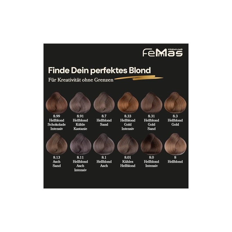 SO INDIVIDUELL WIE DU: Mit unserer FemMas Oxycreme (separat erhältlich), wahlweise mit 3%, 6%, 9% & 12%, mischt Du Dir Deine ganz individuelle Farbnuance und hellst Deine Haare dabei um 1 bis 5 Nuancen auf. (Gebrauchtsanwendung ist im Anhang)