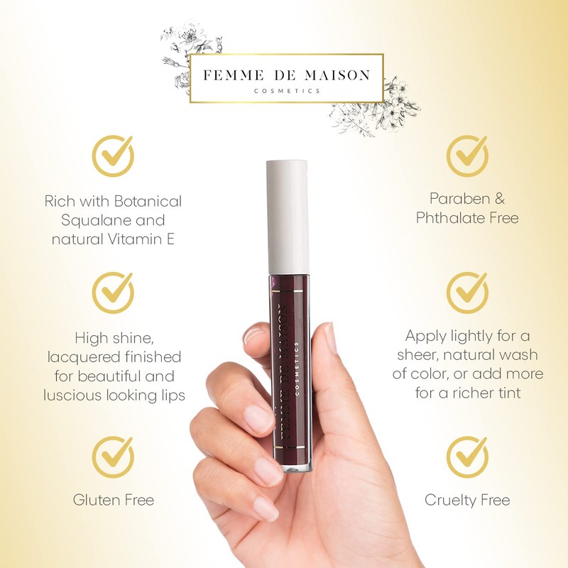 - BOTANICALLY ENRICHED LIP GLOSS - Femme de Maison Cosmetics are Gluten, Paraben and Phthalate-free and never tested on animals...this ensures your lips are the healthiest they can be! Our lip gloss is enriched with botanical Squalane and natural Vitamin E to keep lips looking full, soft, and beautiful all day.