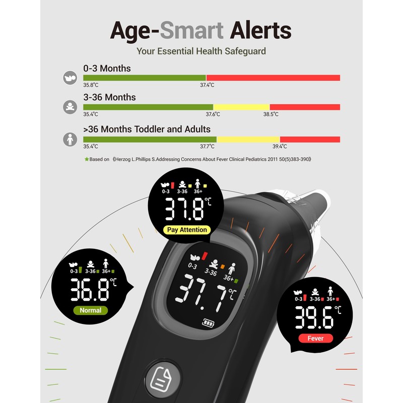 - Intelligente Altersgruppen-Temperaturanzeige: Farbcodierte Symbole zeigen sofort, ob die Werte für drei Altersgruppen (0-3, 3-36, 36+ Monate) im Normalbereich liegen. Einfache Interpretation dank intuitivem Temperatur-Bewertungssystem