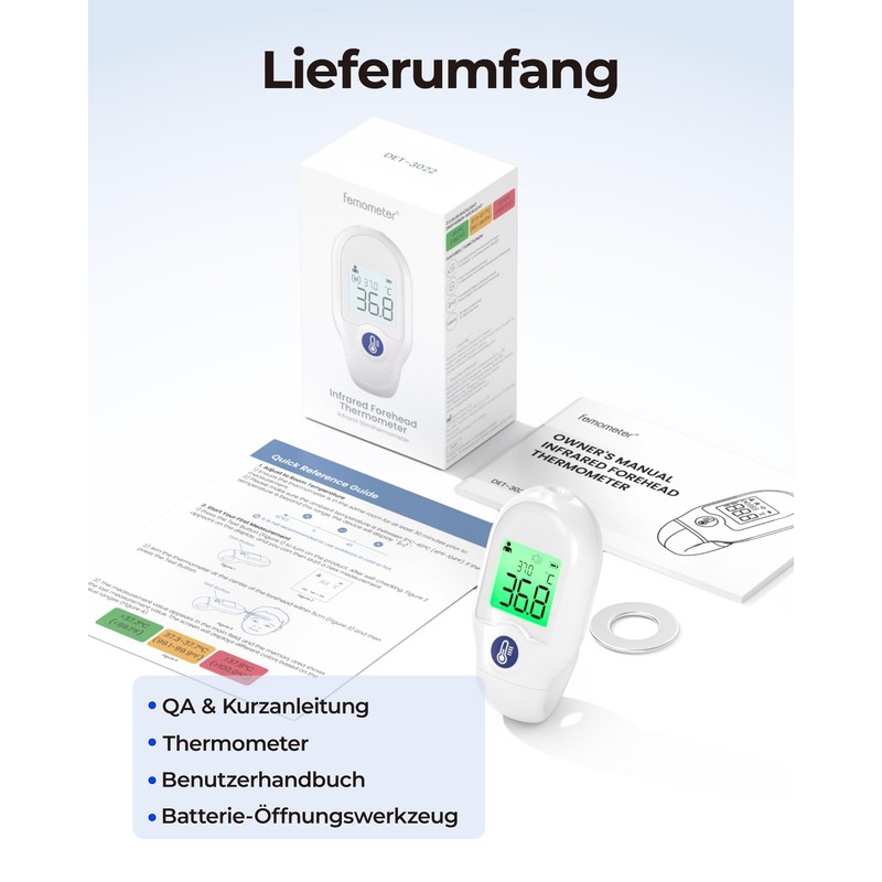 Femometer Fever Thermometer for Babies, Children and Adults, Contactless, Infrared, Measurement in 1s, Three-Colour Display, Object and Room Temperature, Portable for Travel Use, Fever Warning, White