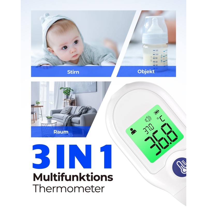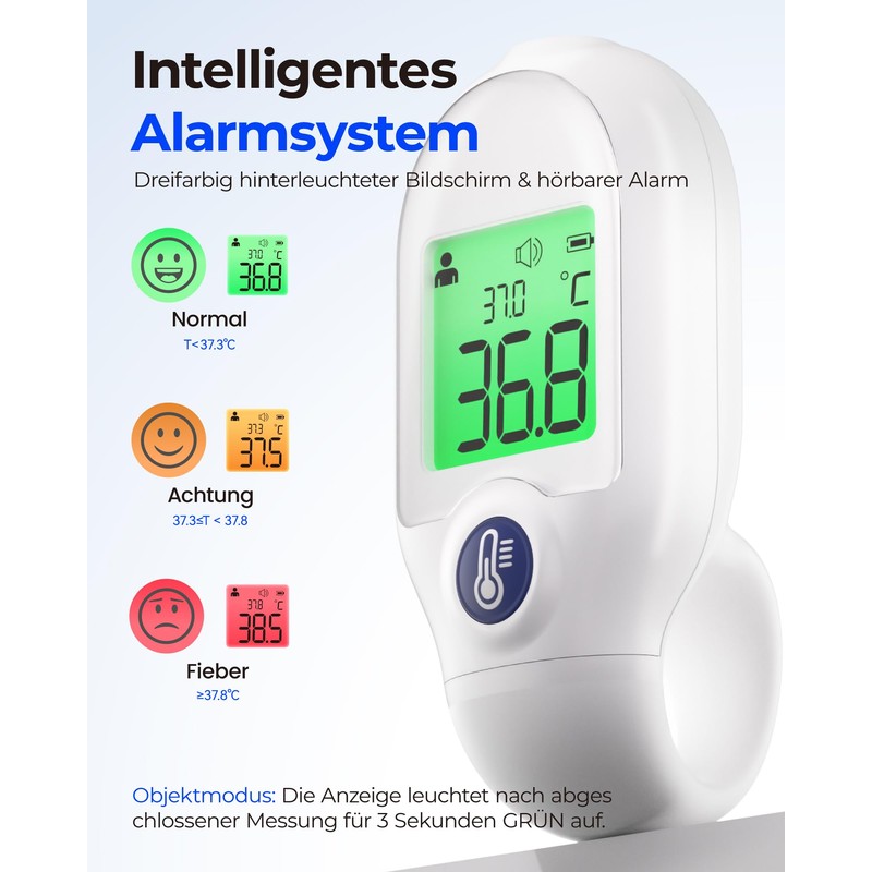 - 3 in 1 Multifunction Thermometer with Color Display: not only measures body temperature, but also objects (milk, food) and room temperature. The intelligent colour display (green/yellow/red) and alarm sound make it the perfect children's thermometer and indispensable helper for the whole family.