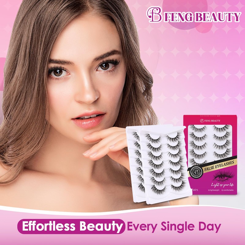 FENG BEAUTY Natural Wispy Cat Eye False Eyelashes Lightweight Fluffy Fake Lashes with Clear Band for Daily Wear Soft Synthetic Fiber Natural Look Lash Strips 7-Pair Value Pack