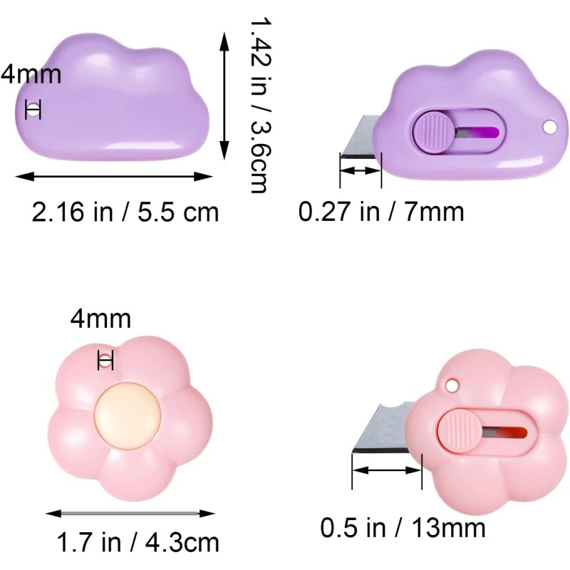 - Tiny Size: Cloud shaped knife- 2.16 x 1.42 inch/ 5.5 x 3.6cm (L*W), ejected blade length- 0.27 inch/7mm; flower shaped knife- 1.7 inch/4.3cm in diameter, ejected blade length- 0.5 inch/ 13mm. Keychain hole diameter: 4mm. Can be DIY a special portable box cutter.