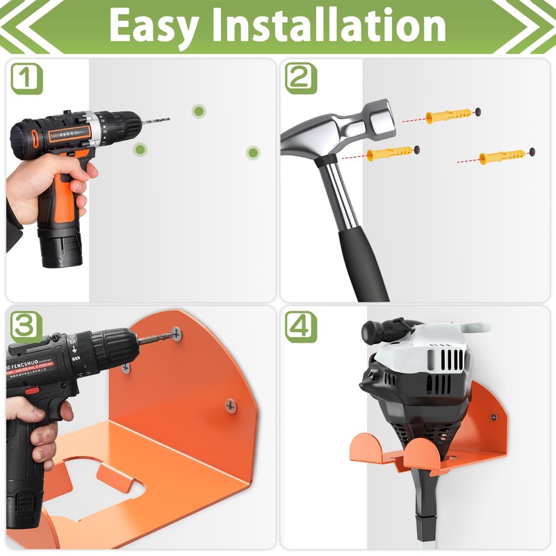 【Easy Installation】1.Mark and drill hole 2. Install and tighten the srcew 3. Finished. The Wall Mounted Trimmer Hanger can be mounted on as well as drywall, concrete, brick wall, and wooden wall