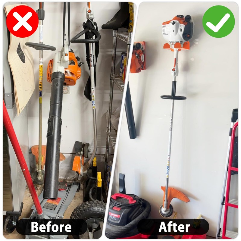 - 【 Space Saving】Our Weedeater Hanger holds your trimmer securely, keeps it off the ground for easy access, allows you to free up valuable space in your garage, shed, home, or enclosed trailers, and is free to place your tools where you like