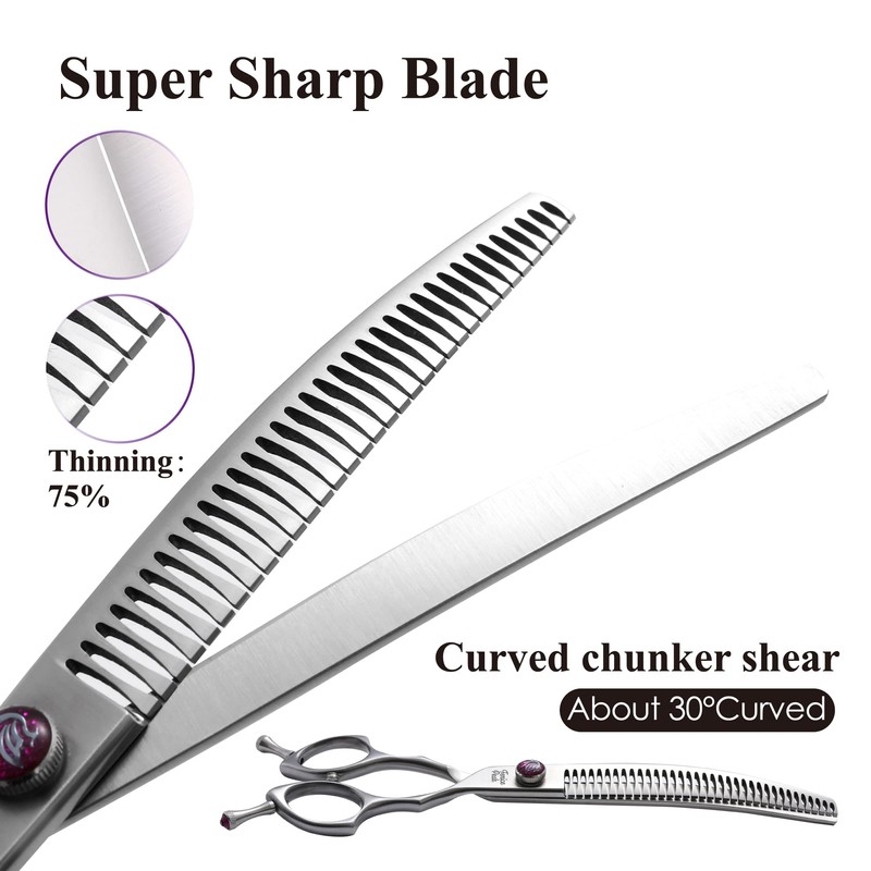 Fenice Peak 7.5‘’ Curved Chunker Dog Grooming Scissors with Purple Flashing Screw Professional 440C Stainless Steel Natural Color Pet Trimming Shears with Offset Handle Durable and Sharp
