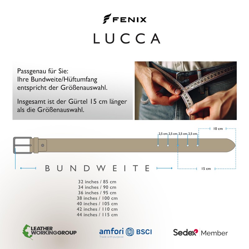 • Robust jeans companion – The Fenix Lucca belt, specially designed for jeans, is characterised by its coarse embossing and coarse strength, perfect for a casual and robust look.