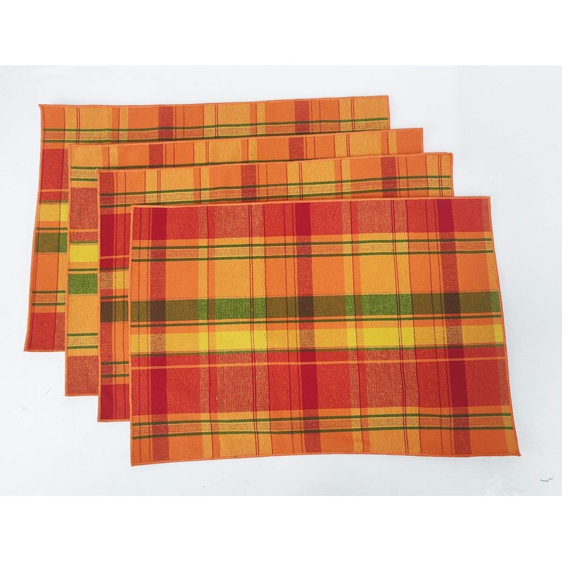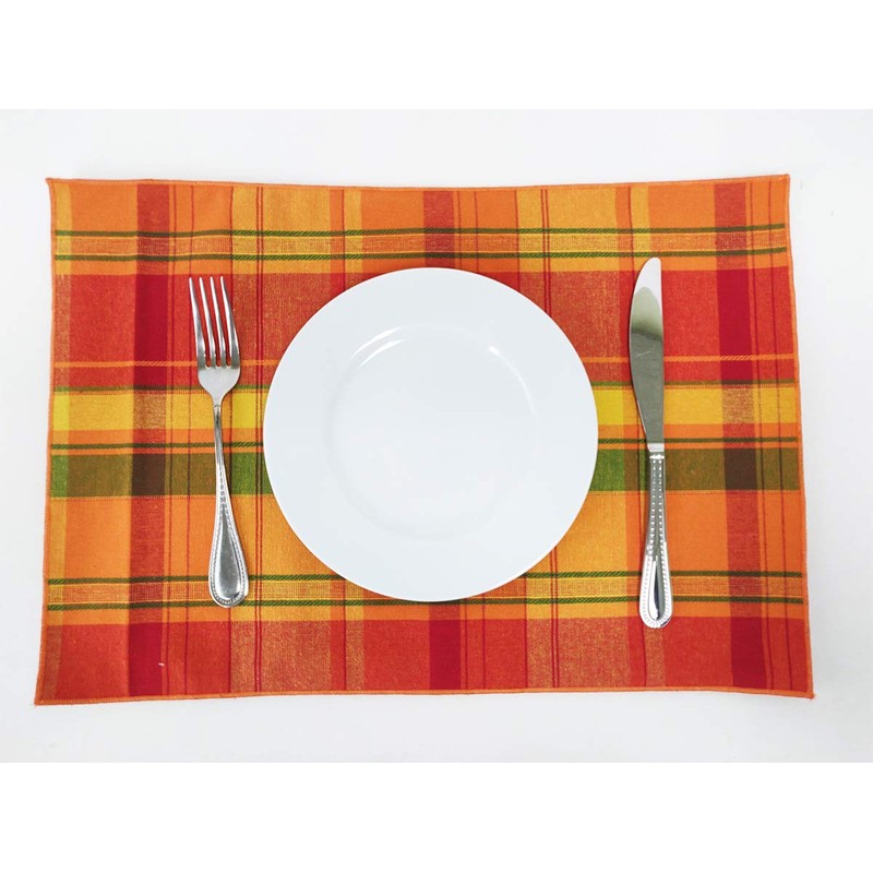 - Beautiful harvest plaid design rectangular table placemats, this placemat set has a red, terracotta and yellow plaid reversing to solid beige color.