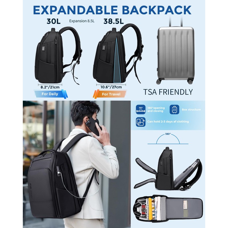 - 【EXPANDABLE TRAVEL BACKPACK】 The computer backpack offering a normal capacity of 30L (18x12x8.2 inches) and an extended capacity of 38.5L (18x12x10.6 inches), making it ideal for packing 2-3 days' travel essentials. Weighs: 2.45 pounds. TSA-approved opening and a velcro design, it easily transforms the laptop bag between 45° and 180° for quick and convenient access, seamlessly switching between commuting and travel modes.