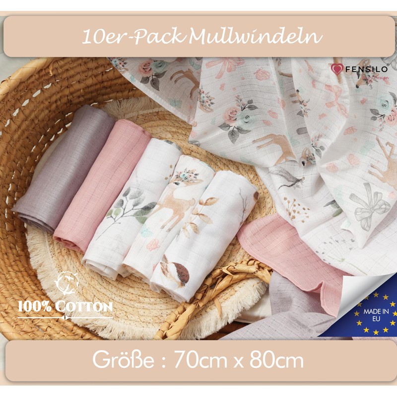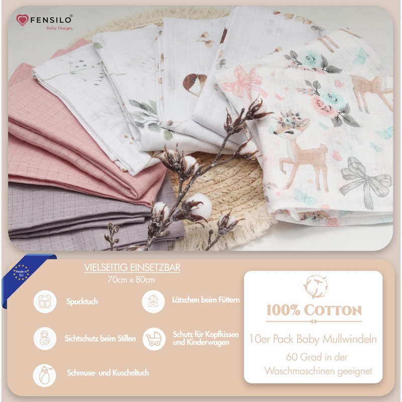 FENSILO Muslin Nappies | Muslin Cloths - Pack of 10 70 x 80 cm | Cloth Nappies | Wiping and Covering Newborns | Muslin Squares for Babies | Coffee