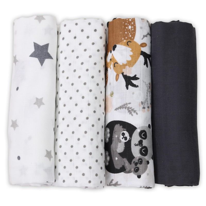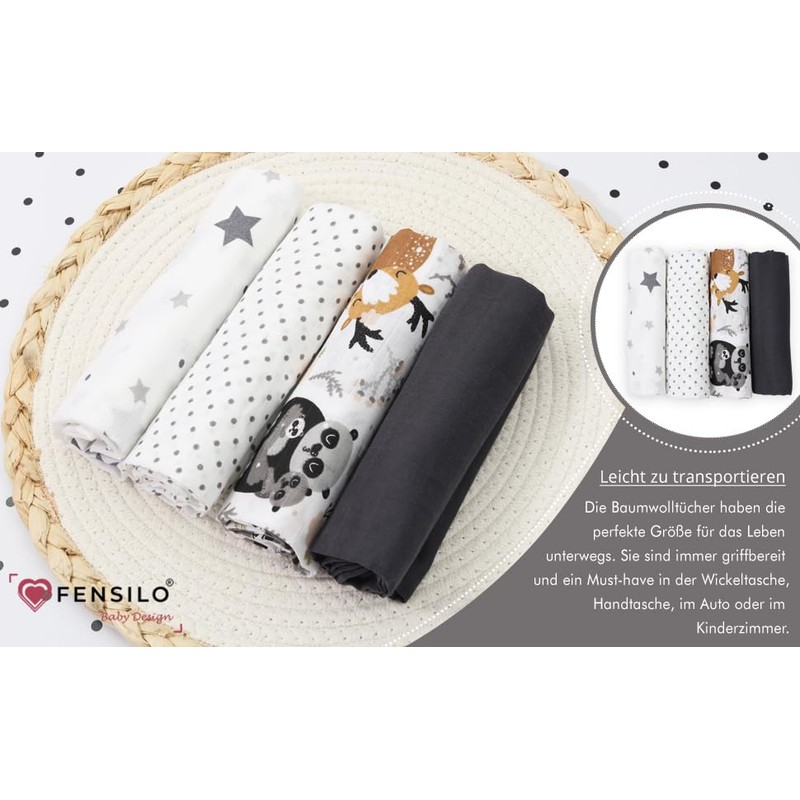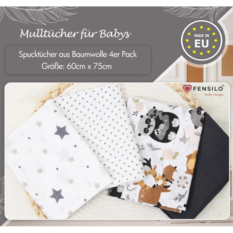 FENSILO Muslin Squares for Baby 60 x 75 cm Pack of 4 Muslin, Made in the EU, Cuddle Cloth Haunting Cloth for Boys and Girls, Muslin Cloths, Baby Burp Cloths - Black and White Animals