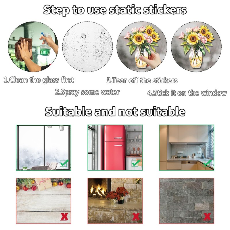 Fensteraufkleber sollten nur auf glatten Oberflächen wie Fenstern, Glastüren, Schaufenstern, Kühlschränken, Schrankleuchten verwendet werden, nicht auf staubigen oder rauen Oberflächen verwenden.