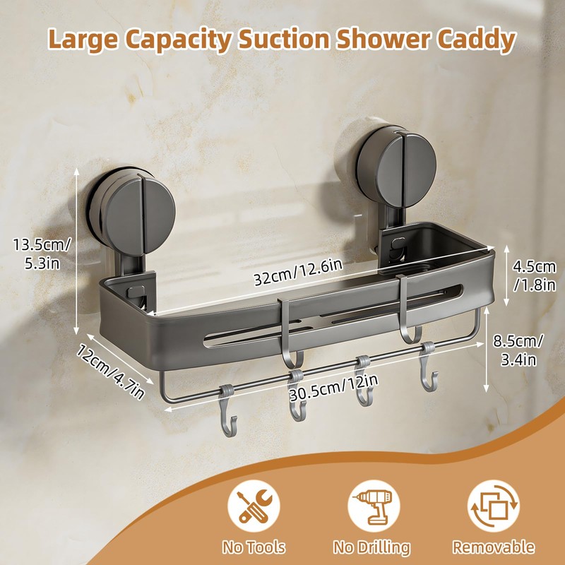 - Extremely strong suction power: Specially developed for smooth surfaces (glass, tiles, metal) - simply press firmly, this shower shelf with suction cup holds securely No drilling, no waiting, no damage. Perfect as a shower shelf without drilling or bathroom shelf without drilling. If you want a new room layout, loosen the shower caddy effortlessly and reposition it without drilling. Ideal for renters and reorganising fans!