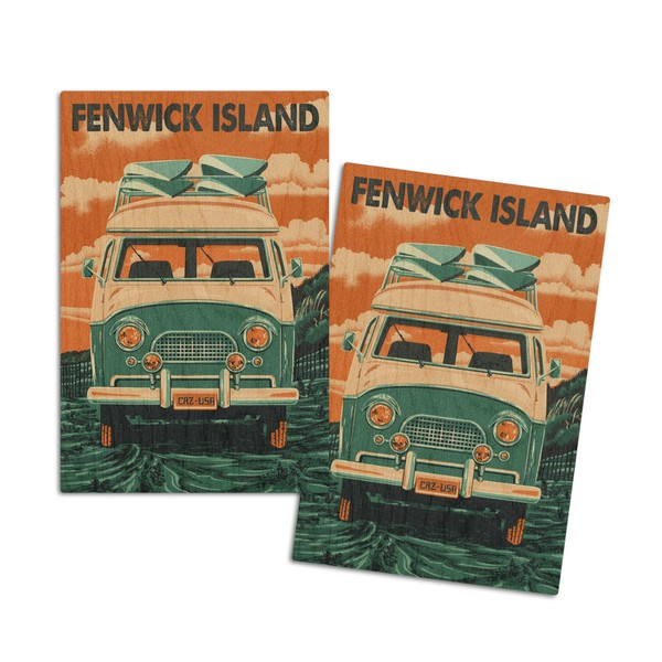 Fenwick Island, Delaware, Letterpress, Camper Van (4x6 Birch Wood Postcards, 2-Pack Stationary, Rustic Home Wall Decor)