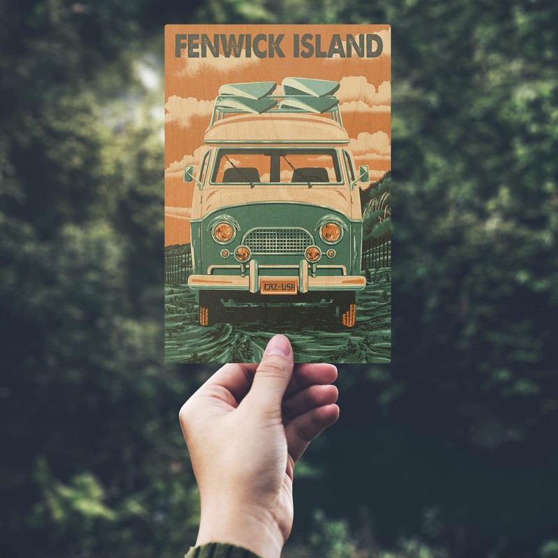 - Fenwick Island, Delaware, Letterpress, Camper Van (4x6 Birch Wood Postcards, 2-Pack Stationary, Rustic Home Wall Decor), high-quality sustainable wood printed in Seattle