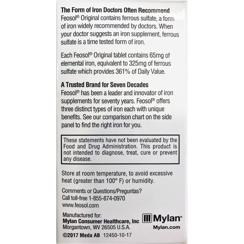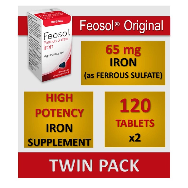 Feosol Original, a high potency iron, contains 65 mg of elemental iron providing 361% of Daily Value. Dietary supplement.