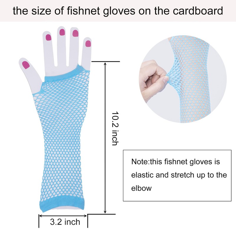- These arm fishnet gloves are of universal size,the size of the mesh sleeves gloves packaged on cardboard is 9.8 inches*3.3 inches,and this arm fishnet sleeve gloves fits most people.
