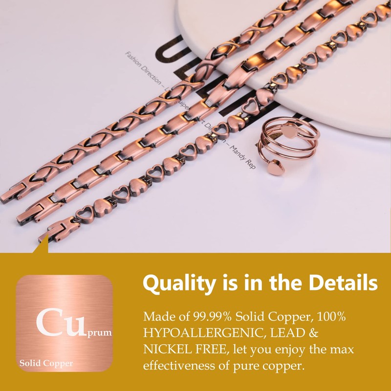 - Pulsera de cobre puro 99,99%: te permite disfrutar del máximo efecto de cobre sólido (no chapado). ), 100% hipoalergénico, sin plomo ni níquel, revestimiento de laca de larga duración para evitar la oxidación, resistente a los arañazos, con cierre fuerte que se mantiene fijo.