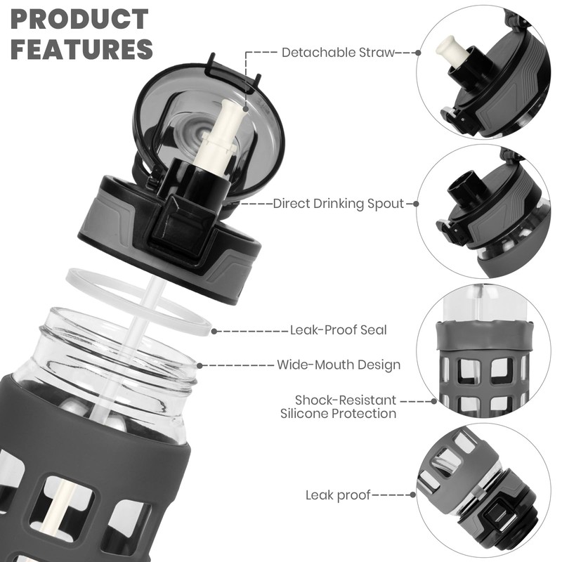 • LEAK-PROOF & SILICONE PROTECTIVE COVER - Glass water bottle has a silicone sealing ring for optimal sealing. The detachable ring can be cleaned anytime to keep it clean and tidy. This glass bottle comes with a silicone protective cover, both stylish and protective.