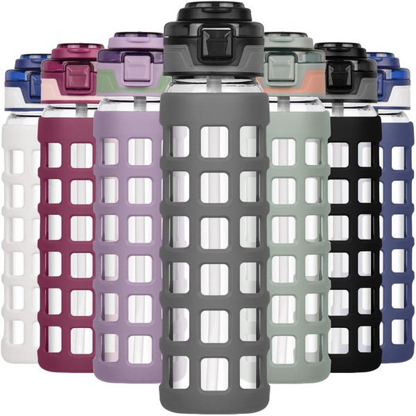 Ferexer 32oz/22oz Glass Water Bottle with Straw Handle Flip lids, leakproof, BPA free, Borosilicate Glass Bottles, with Protective Non-Slip Silicone Sleeve Sports Glass Drinking Bottles Gray