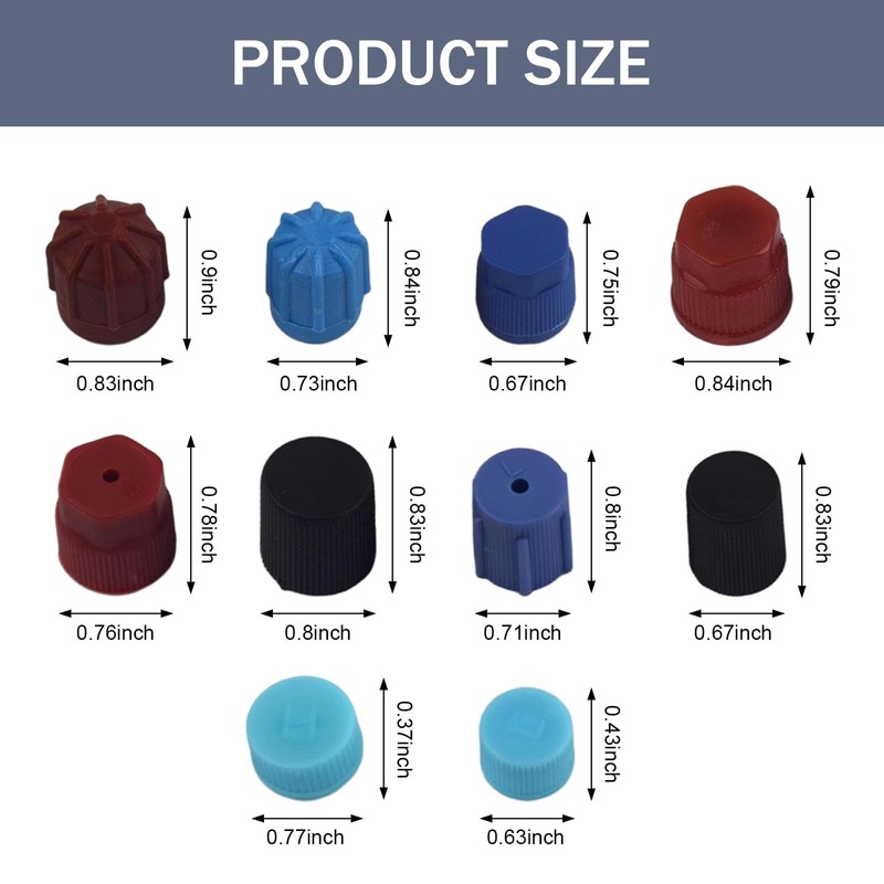 Package Includes: 26 × R12/R134a A/C system valve core dust caps (10 different sizes)