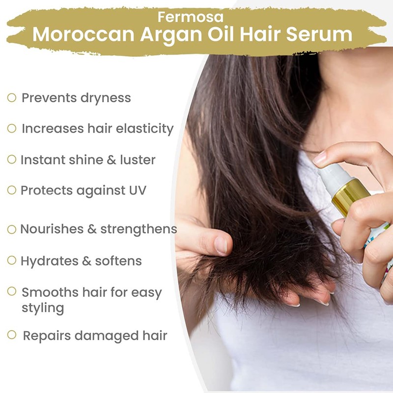 - WHAT DOES IT DO? - Fermosa's Moroccan Argan Oil Hair Serum has a wide array of benefits. These benefits include shine, UV protection, anti dryness, and split end repair. Enjoy all these today with your purchase of Fermosa's Moroccan Argan Oil Serum.