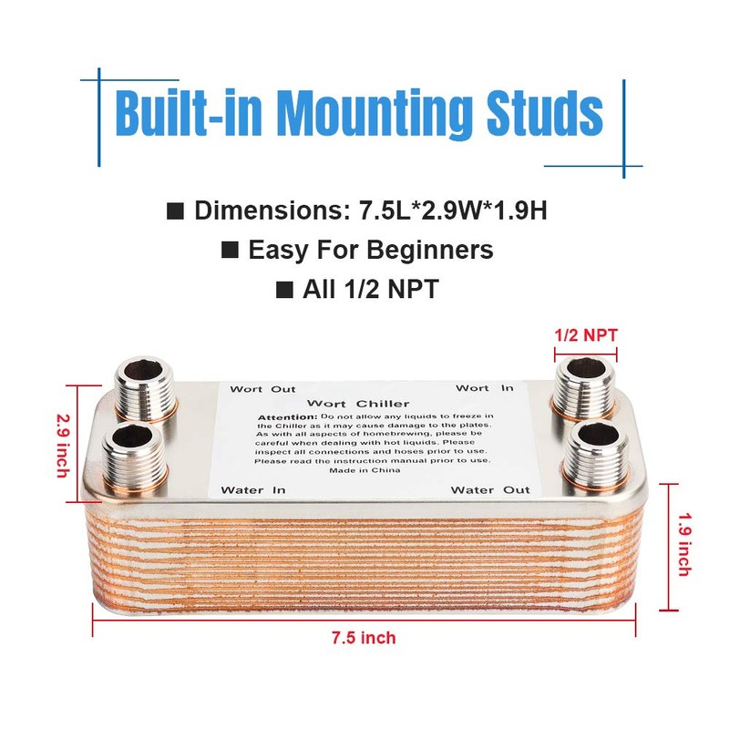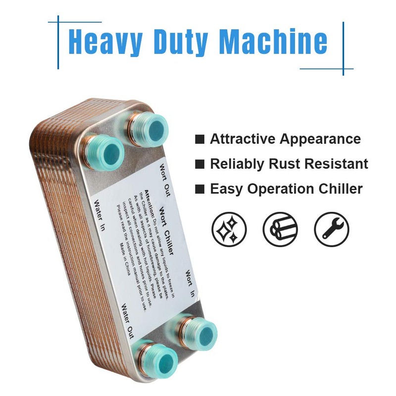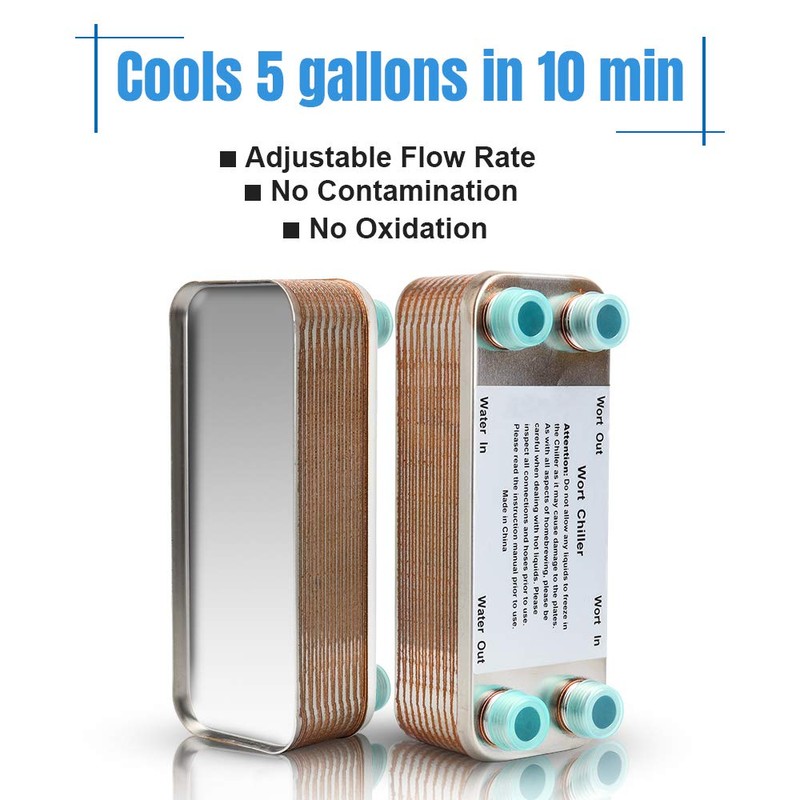 - [Quickly Chilling Beer Wort]: This compact heat exchanger is designed for chilling your beer/ wort/water. Compared with the immersion chiller, our heat exchanger has 20 brazed plates and cools wort within minutes rather than several hours.