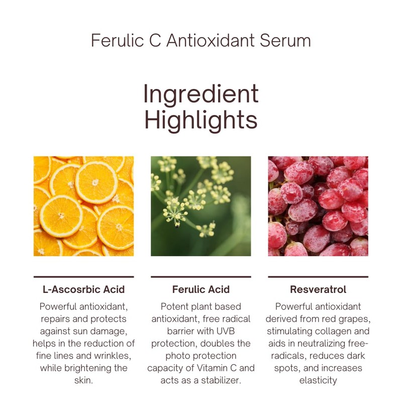 - .05% FERULIC ACID / VITAMIN E – A powerful plant based antioxidant, free radical barrier with UVB protection, doubles the photo protection capacity of Vitamin C and acts as a stabilizer.