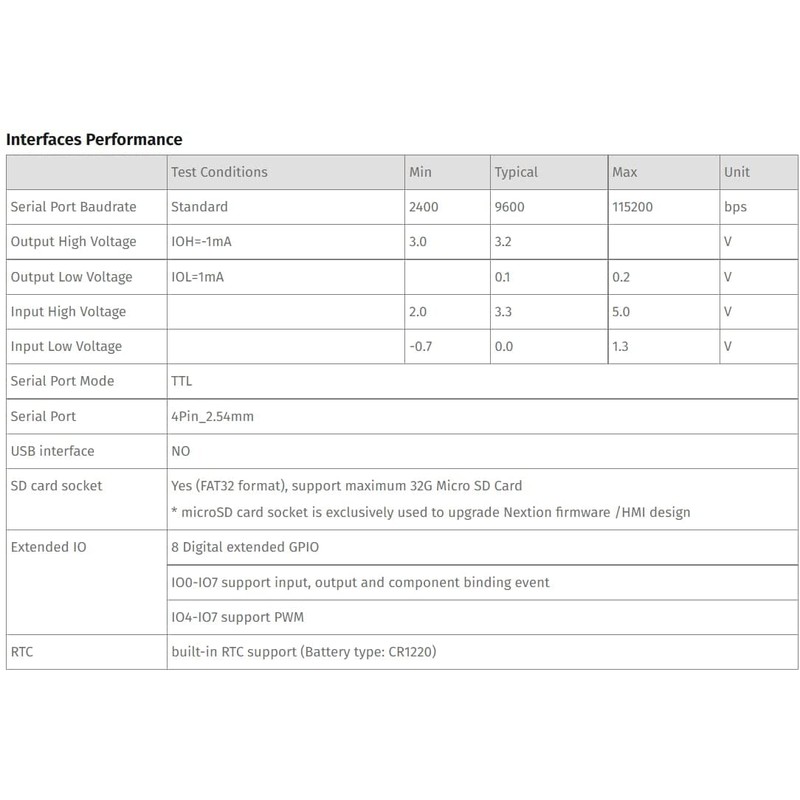 Nextion Enhanced series is more powerful compared to Nextion Basic series. Besides a faster MCU clock, the Enhanced series supports: built-in RTC, 1K EEPROM for user data, 8 digital GPIO and larger flash capacity.