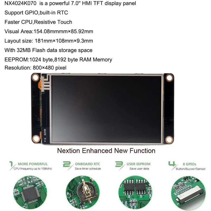 - Compared to the basic version 7.0", Nextion Enhanced 7.0" offers new features: support for integrated RTC, data storage in flash memory, GPIO, larger flash memory capacity and faster CPU. With 1024 byte EEPROM, 8192 byte RAM, 32 MB flash data memory, 800×480 resolution, visible area: 154.08 mm × 85.92 mm, layout size: 181 mm × 108 mm × 9.3 mm. Color: 65K ( 65536) colors.