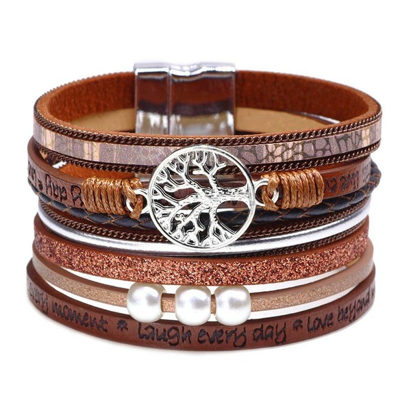 Fesciory Leopard Bracelet for Women, Boho Leather Wrap Multi-Layer Pearl Crystal Bracelet Bangle Jewelry(Tree of Life(Brown))