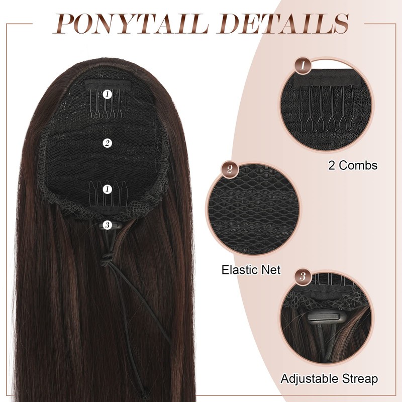 - Drawstring design: this ponytail is pulled with a system of comb and elastic pull on your own hair plugged together. The drawstring ponytail ensures an even secure hold and a completely opaque approach.